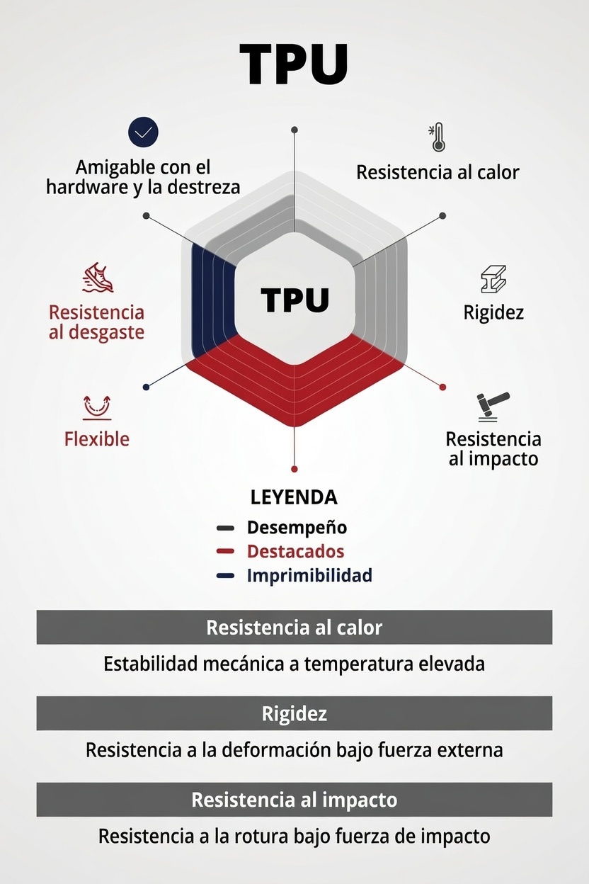 Es nuestro filamento más versátil. Este material nos permite fabricar plantillas con diferentes durezas y densidades, proporcionándonos partes más rígidas para contener o partes más blandas para amortiguar.